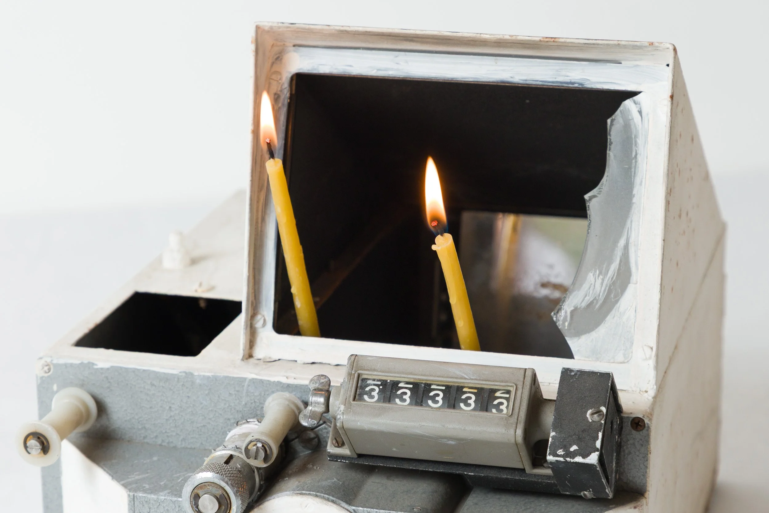 La imagen del impulso nunca deja de gritar (2025). Moviola intervenida con velas de cera de abeja. Dimensiones variables.